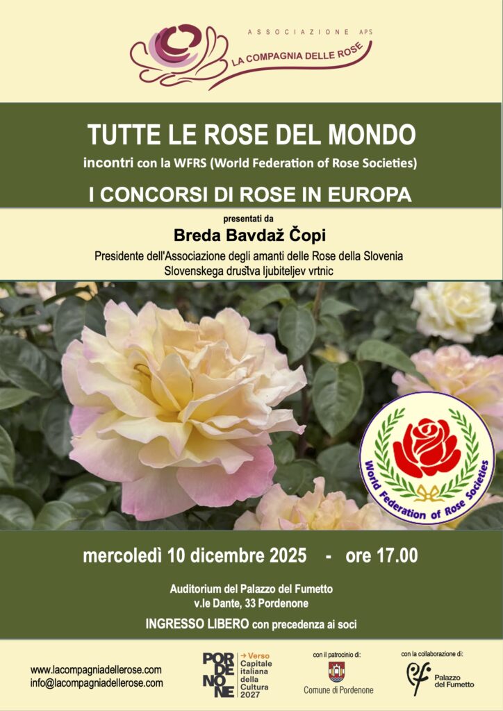 L’incontro che si terrà mercoledì 10 dicembre alle ore 17.00, presso l’Auditorium del Palazzo del Fumetto a Pordenone, con il patrocinio del comune di Pordenone-Assessorato alla cultura e del Palazzo del Fumetto, vedrà la presenza di una importante rappresentante del ‘mondo delle Rose’: Breda Bavdaž Čopi, Past Vice-President Europe WFRS-World Federation of Rose Societies e Presidente della Associazione degli amanti delle Rose della Slovenia (Slovenskega društva ljubiteljev vrtnic).